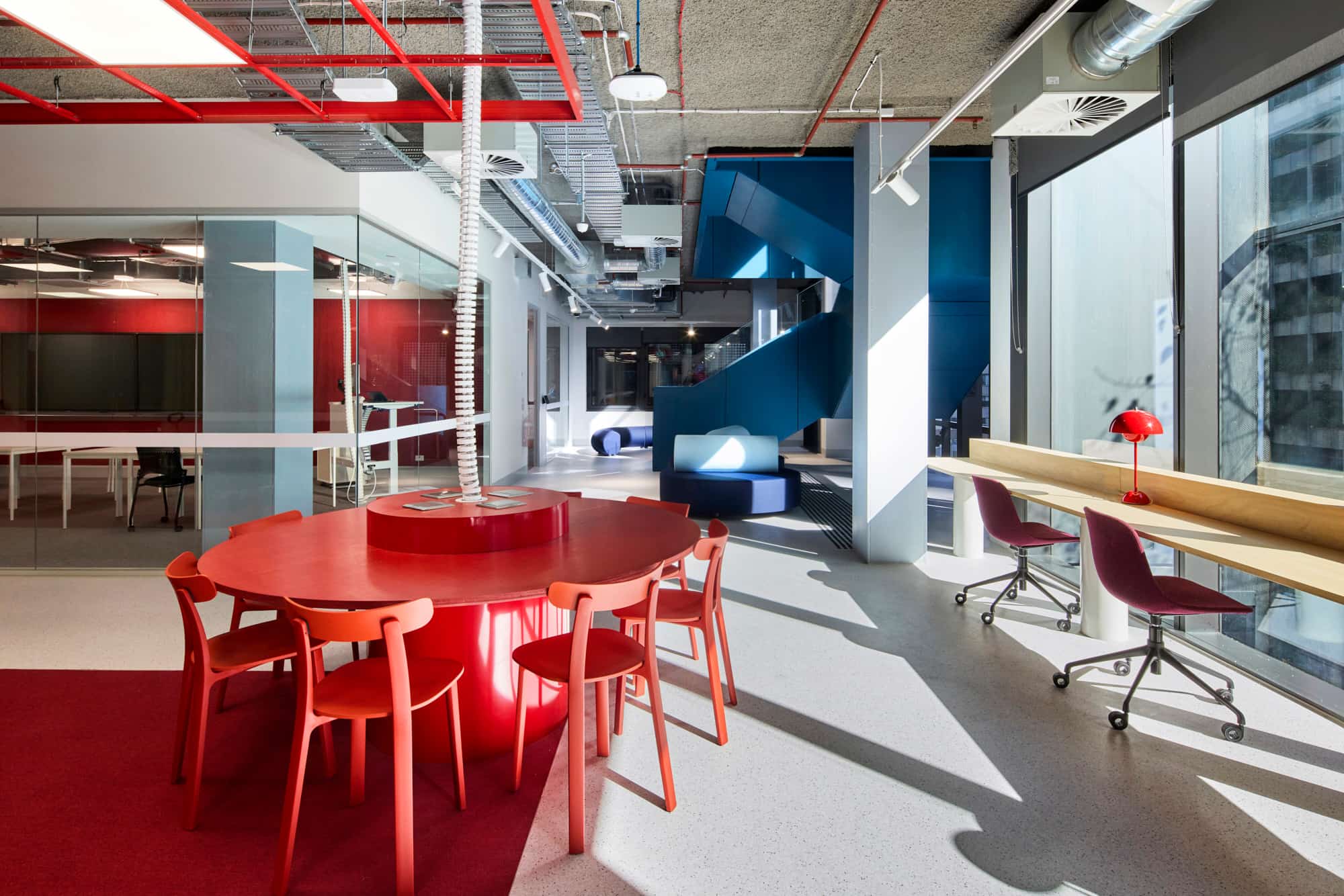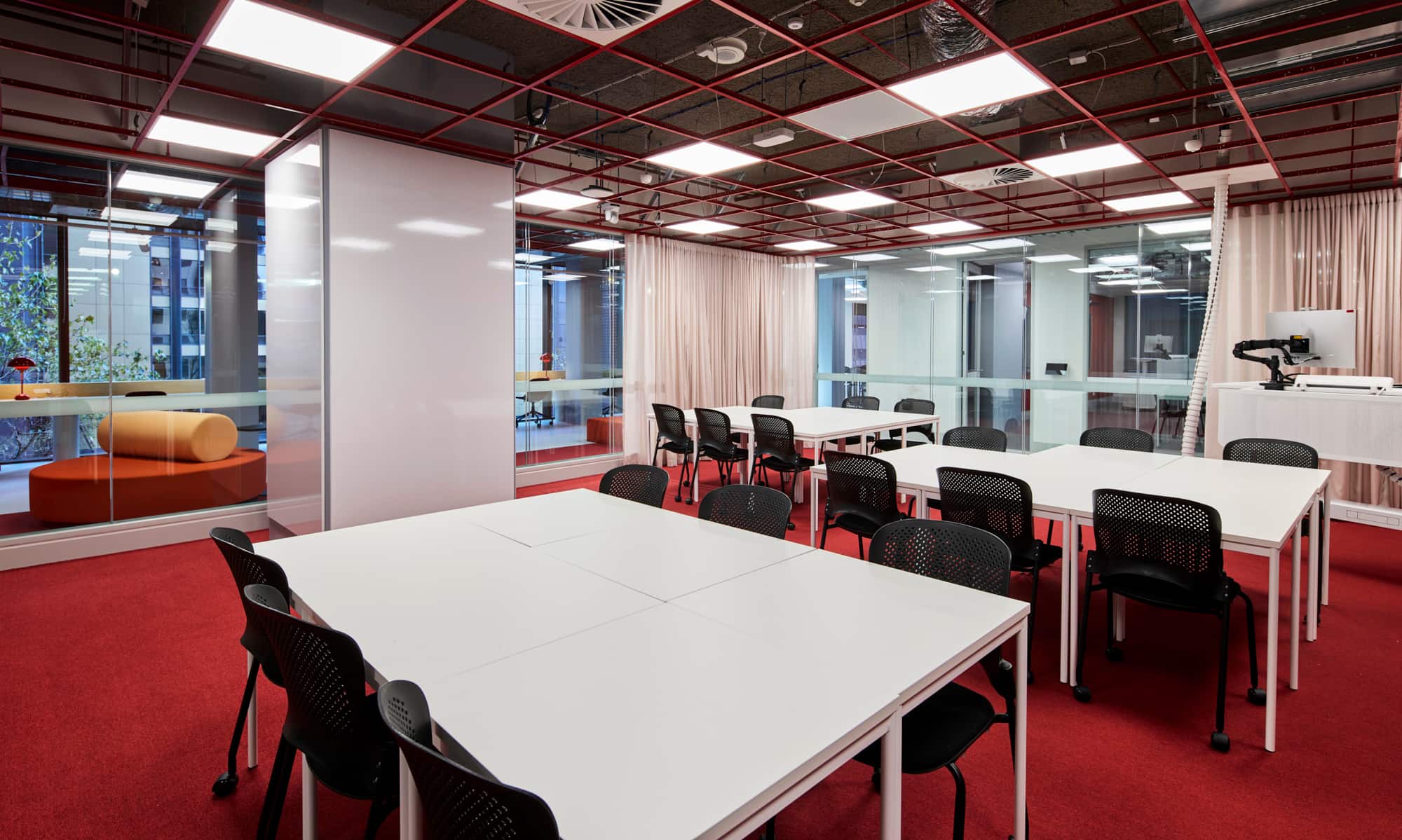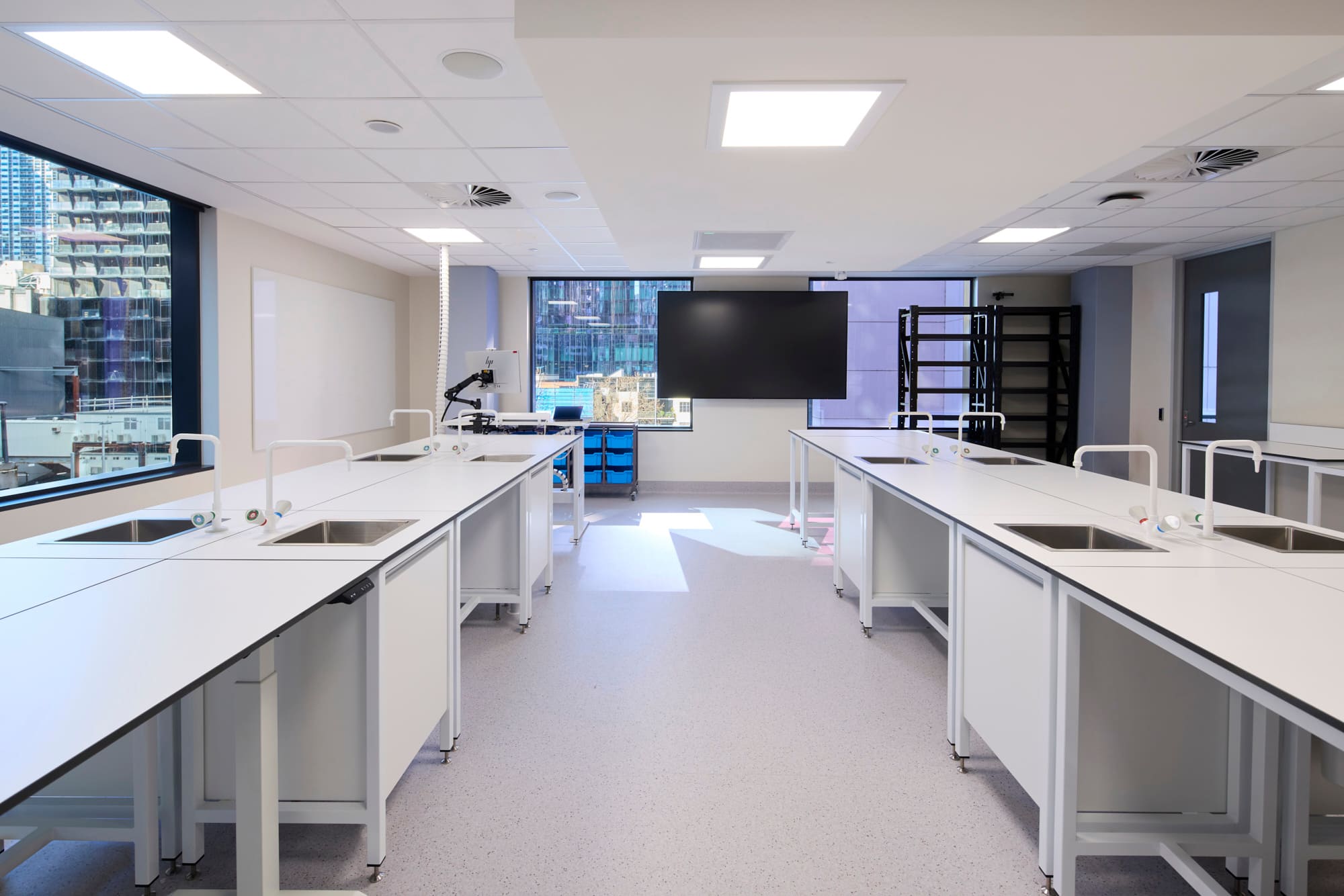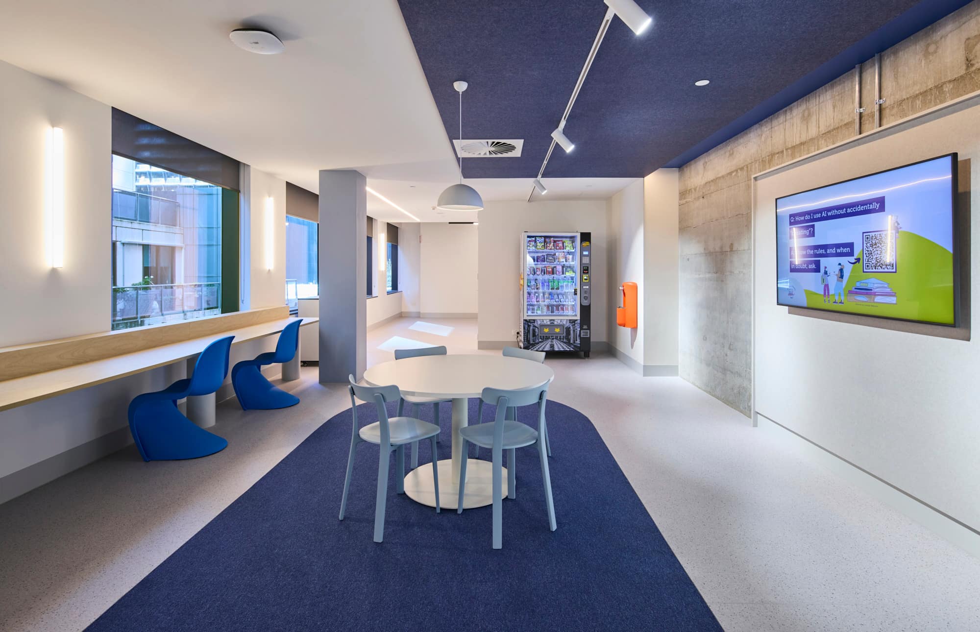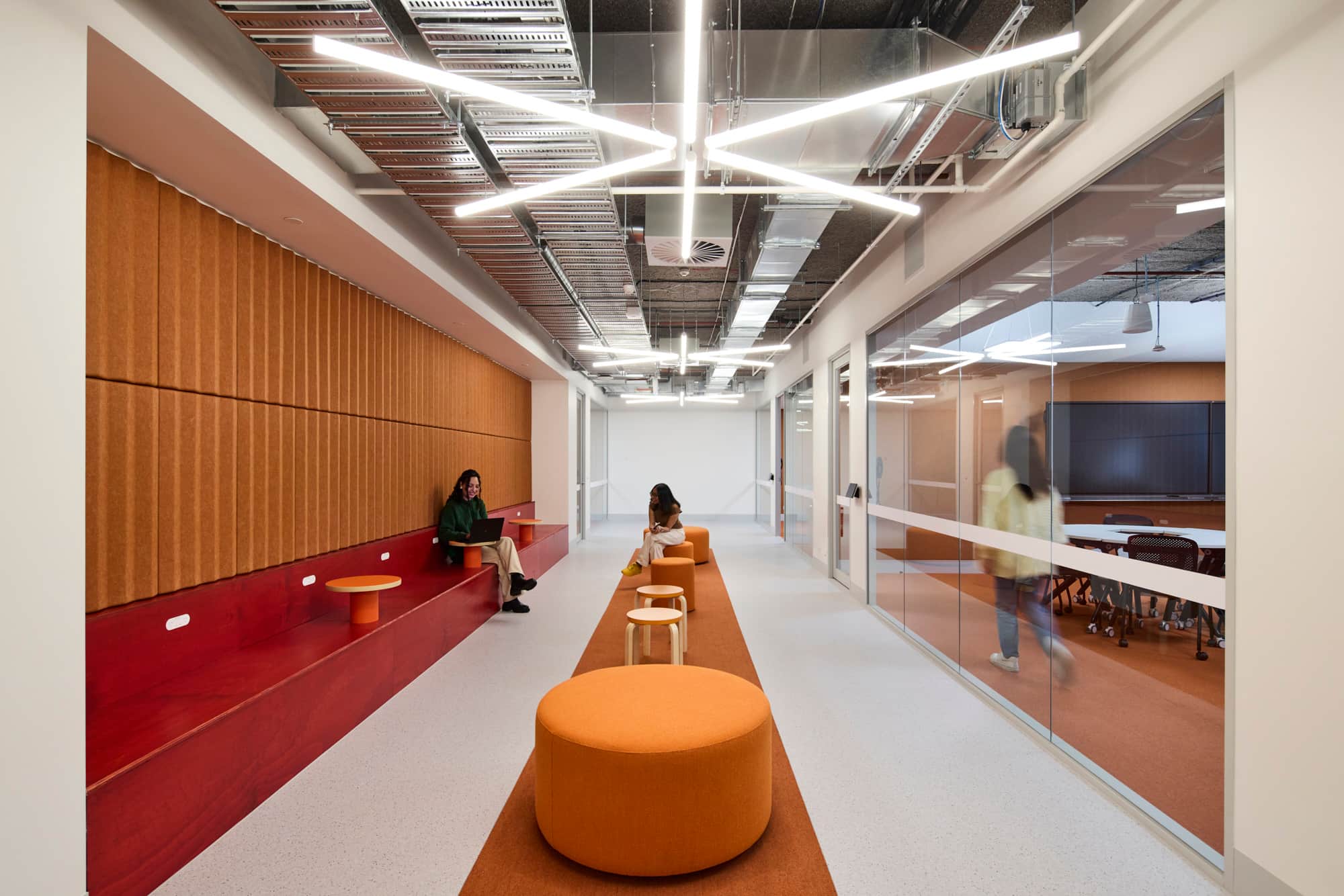 It features modern classrooms and specialist spaces for Art, Computer Design, Business, and the Sciences across four teaching floors. Each floor houses approximately ten classrooms designed to foster collaboration, and numerous breakout areas, quiet study spaces, and common areas, all designed with colourful aesthetics making use of natural light.